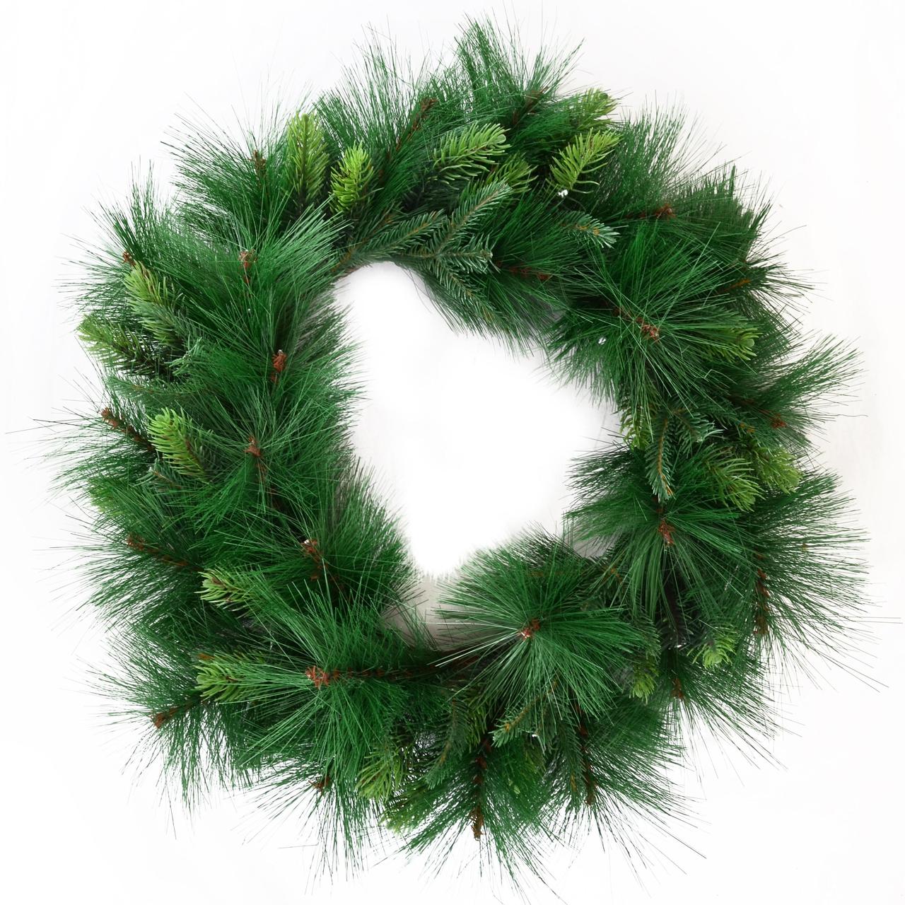 Гарний пишний вінок — традиційний підвісний декор для вхідних дверей будинку і офісу у період новорічних свят. Різдвяний вінок можна прикрашати зимовими ягодами, гілочками, пуансетією, ялинковими кулями і іншим декором. Всі матеріали екологічно чисті, мають протипожежні властивості. Висока якість матеріалу дозволяє виробу бути не тільки оригінальним і красивим, а ще й довговічним. Матеріал: ПВХ плівка зеленого кольору, дріт. Ширина хвої — 6 см. Діаметр: 35 см.
